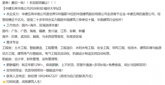 中建五局是世界500强第18位、全球投资建设集团第1名、国务院国资委直接管理的中央大型企业----中国建筑集团公司的重要骨干成员企业。中建五局总资产过1000亿元,年经营规模过2000亿元,累积投资额超3000亿元,位居湖南省100强企业前3名。 中建五局华南公司是中建五局的直营公司,保持多年健康快速发展,近二十年综合实力始终保持在中国建筑直营公司前列、五局二级单位数一数二,是华南地区最具竞争力建筑施工企业之一。 中建五局华南公司深圳分公司连续六年被评为局明星分公司,综合实力在五局三级单位中排名”数一数二“。其总部位于粤港澳大湾区核心、中国特色社会主义先行示范区——深圳。下设深圳、惠州、粤东三个片区,并积极开拓印尼、越南市场综合实力稳居五局三级单位前三强。承建了星河丽兹卡尔顿酒店、深圳湾1号广场等一大批地标建筑,在前海承建地标11座,形成规模性总部大厦集群。拥有超高层建筑、超大型房建、市政基础设施等领域技术和经营优势。近年来,分公司获得了“建筑工程鲁班奖”“全国五一劳动奖状”“全国优秀施工企业”“中国最具成长性企业”“全国五一劳动奖章”“国际中国公益践行奖”等重量级荣誉近百项。