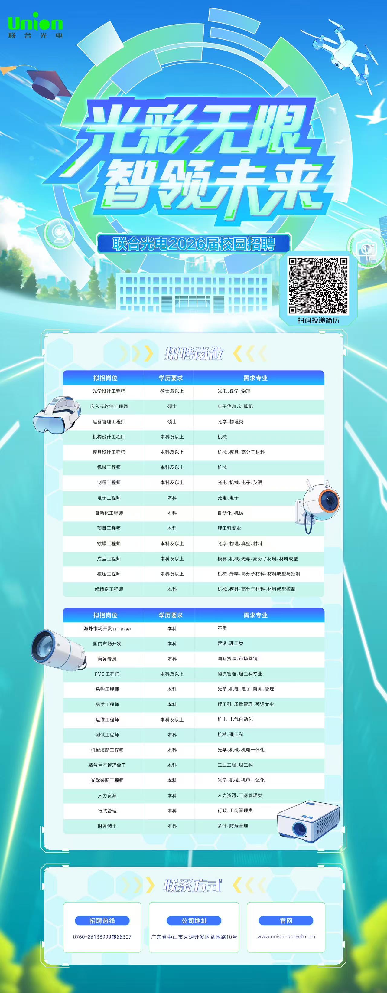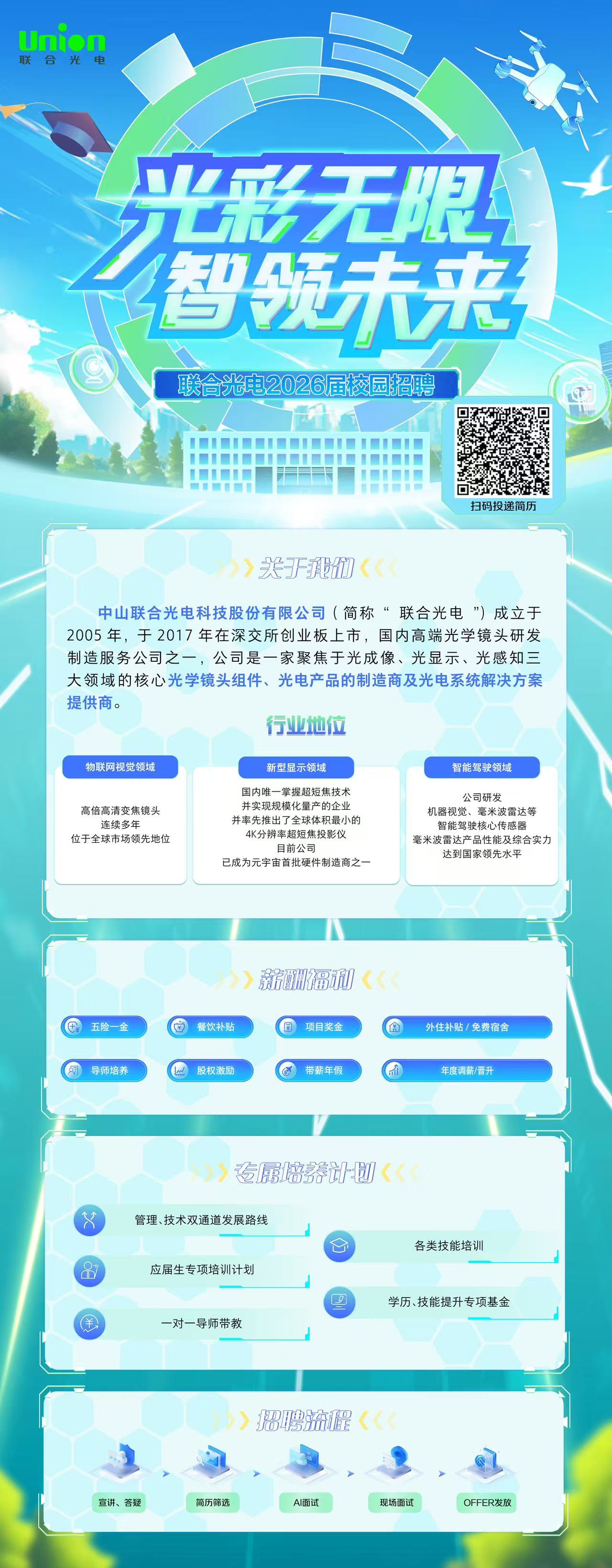 (2)简历投递邮箱:jobs@union-optech.com(备注姓名+意向岗位+学校+学历+专业),或宣讲会现场网申