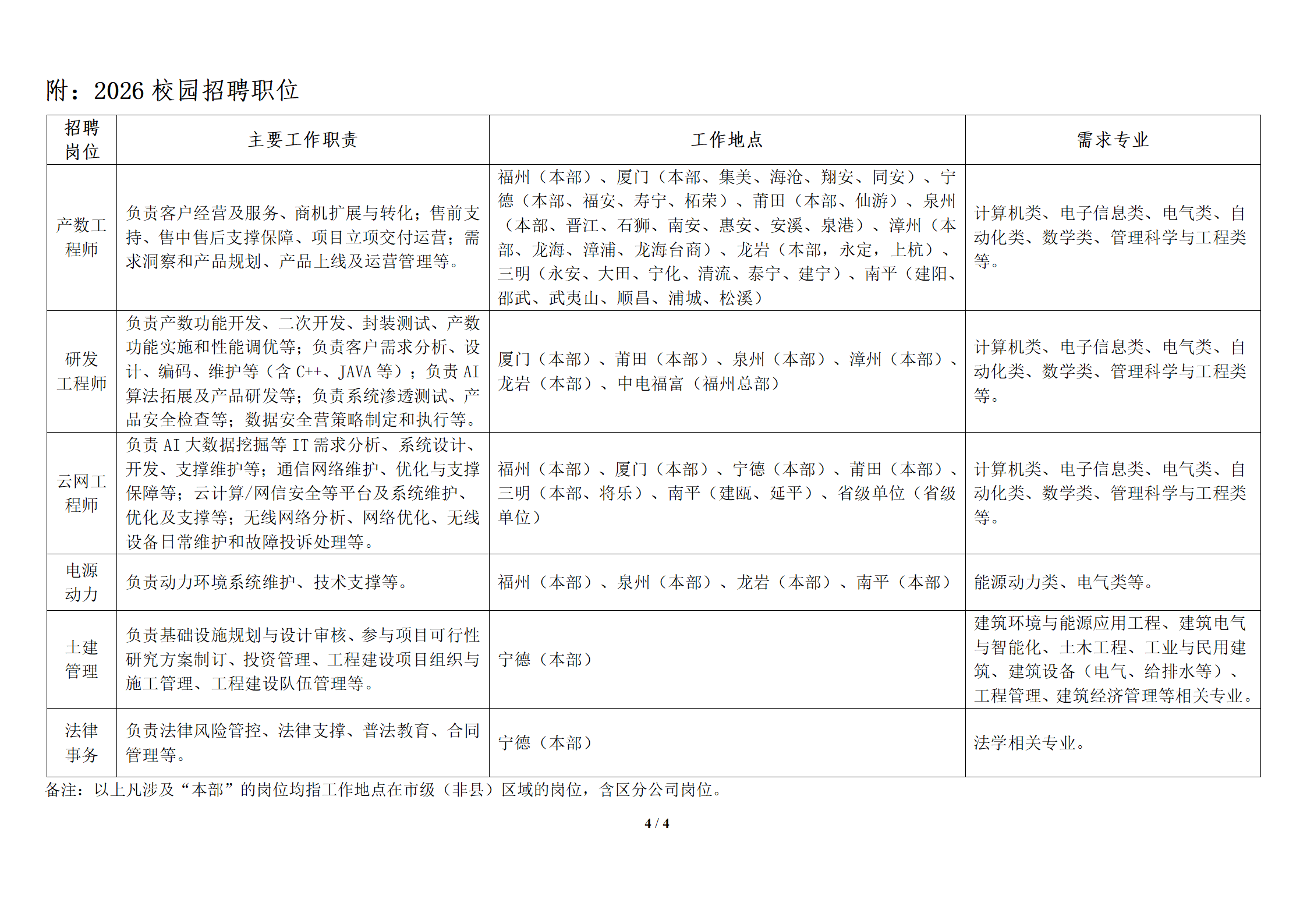 附件:1.中国电信股份有限公司福建分公司2026校园招聘职位